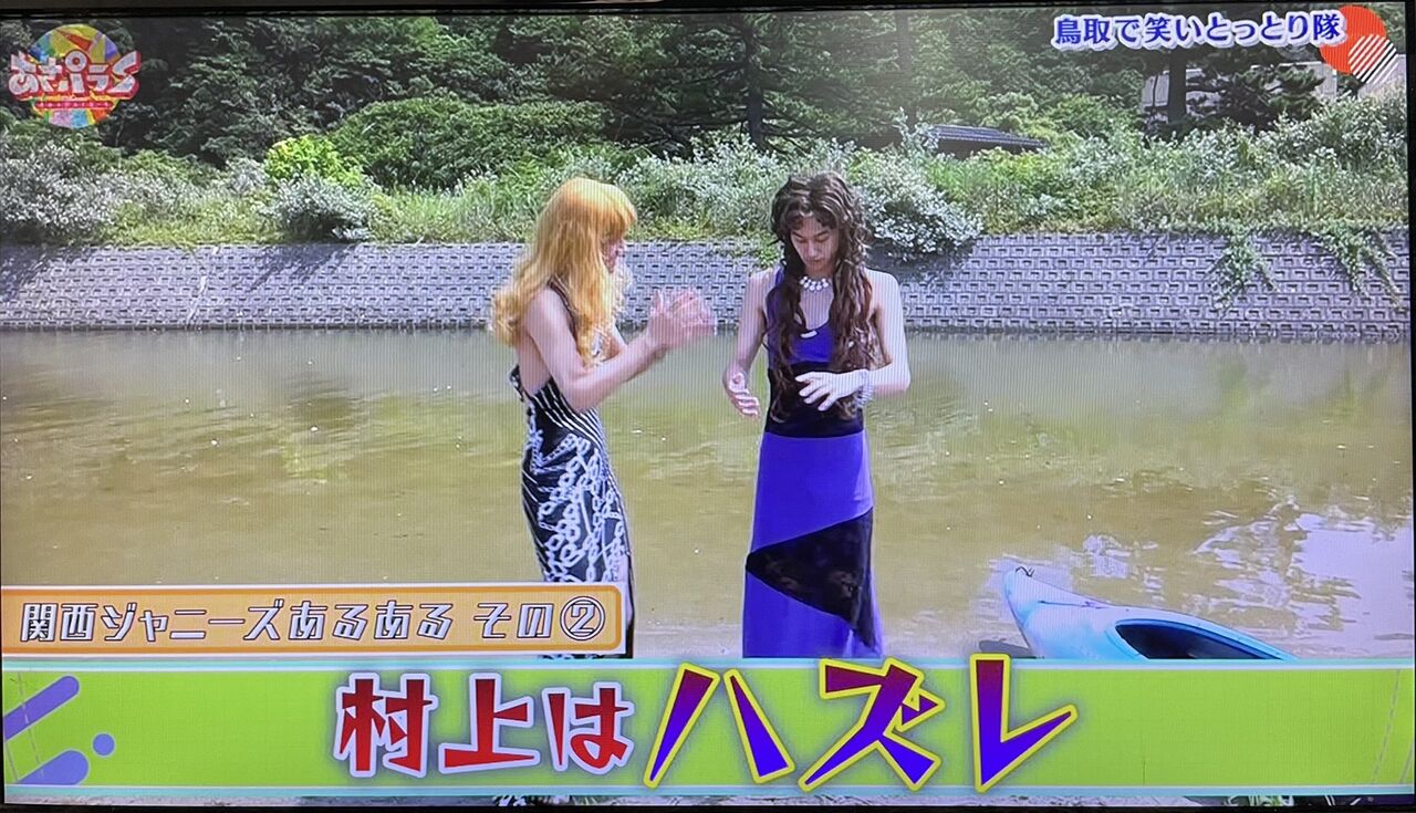 小島と佐野は岩美町のカヌー体験スポットで女装姿で登場。叶姉妹のパロディ「カヌー姉妹」としてコントを繰り広げた。佐野は小島のドレスに「汚いわねぇ」と毒づいた後、ハっとしたように「“汚い衣装が用意されている”。関西ジャニーズあるあるその1。先輩からのおさがりの汚い衣装だけでコンサートをするの」と、突然“あるあるネタ”を披露。「首元のタグを見てごらんなさい」と、小島のドレスを確認するような素振りをみせた佐野は、「あらやだ! 村上って書いてあるぅ~!」と大げさにリアクションし、小島が「村上って、あの関ジャニ∞の?」と補足したのに続けて、佐野は「覚えておきなさい。関西ジャニーズあるあるその2。村上はハズレ」とバッサリ切り捨てた。さらに小島が「アタリとかあるの?」と聞き返すと、佐野は「村上だけはハズレなの」と強調。「関西で生きていくならそれぐらい常識!」と言い放ち、ハイヒールらから「ひどい」などとツッコまれていた。