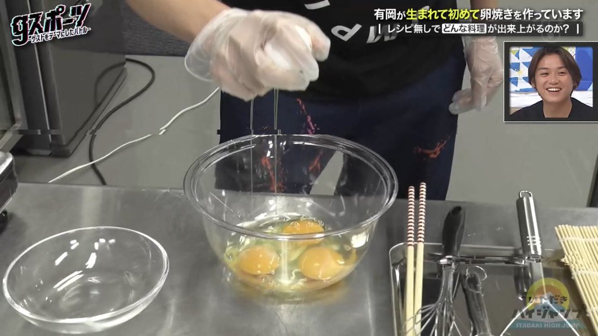 一方、有岡も卵は片手で割っていたが、砂糖やはちみつを入れ、ごま油で焼くという展開に。卵焼きフライパンに卵を一気に流し込んだ結果、中島と同じように黒こげ卵焼きが完成した。